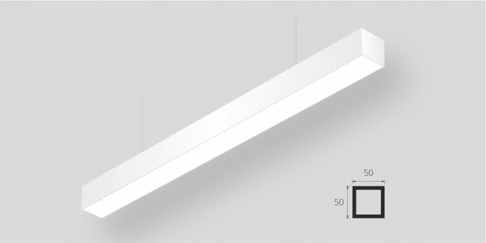 Линейный светодиодный Подвесной светильник LiNE-Pro 50x50 1000mm 40W 5000K Белый предназначен для подвесного монтажа на тросовые подвесы. Изготовлен из алюминиевого профиля длиной 1000 мм, мощностью 40 Вт c цветовой температурой 5000 K, цвет корпуса Белый. Высота установки светильника регулируется подвесом с цанговым тросовым зажимом и может варьироваться от 0,05 метра до 4 метров от основного потолка. Линейный светильник может использоваться для реечных потолков. Светильник имеет равномерную засветку по всей площади рассеивателя. Источник питания находится внутри корпуса. Торцевые заглушки входят в комплект.