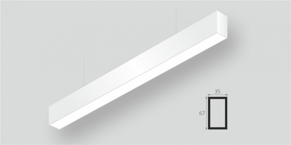 Линейный светодиодный Подвесной светильник LiNE-Pro 67x35 1000mm 45W 6000K Белый предназначен для подвесного монтажа на тросовые подвесы. Изготовлен из алюминиевого профиля длиной 1000 мм, мощностью 45 Вт c цветовой температурой 6000 K, цвет корпуса Белый. Высота установки светильника регулируется подвесом с цанговым тросовым зажимом и может варьироваться от 0,05 метра до 4 метров от основного потолка. Линейный светильник может использоваться для реечных потолков. Светильник имеет равномерную засветку по всей площади рассеивателя. Источник питания находится внутри корпуса. Торцевые заглушки входят в комплект.