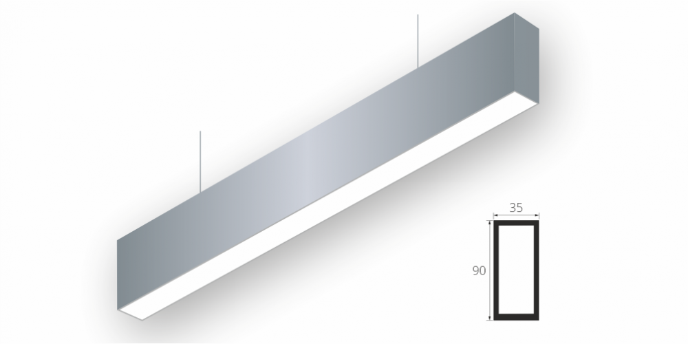 Линейный модульный светодиодный Подвесной светильник LiNE-Pro 90x35 1000mm 45W 6000K Серый предназначен для подвесного монтажа на тросовые подвесы. Изготовлен из алюминиевого профиля длиной 1000 мм, мощностью 45 Вт c цветовой температурой 6000 K, цвет корпуса Серый. Светильники соединяются в сплошную линию с помощью комплекта линейного соединения и сплошной магистральной проводки. Светильник имеет равномерную засветку по всей площади рассеивателя. Источник питания находится внутри корпуса.